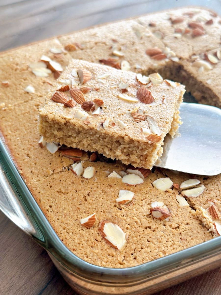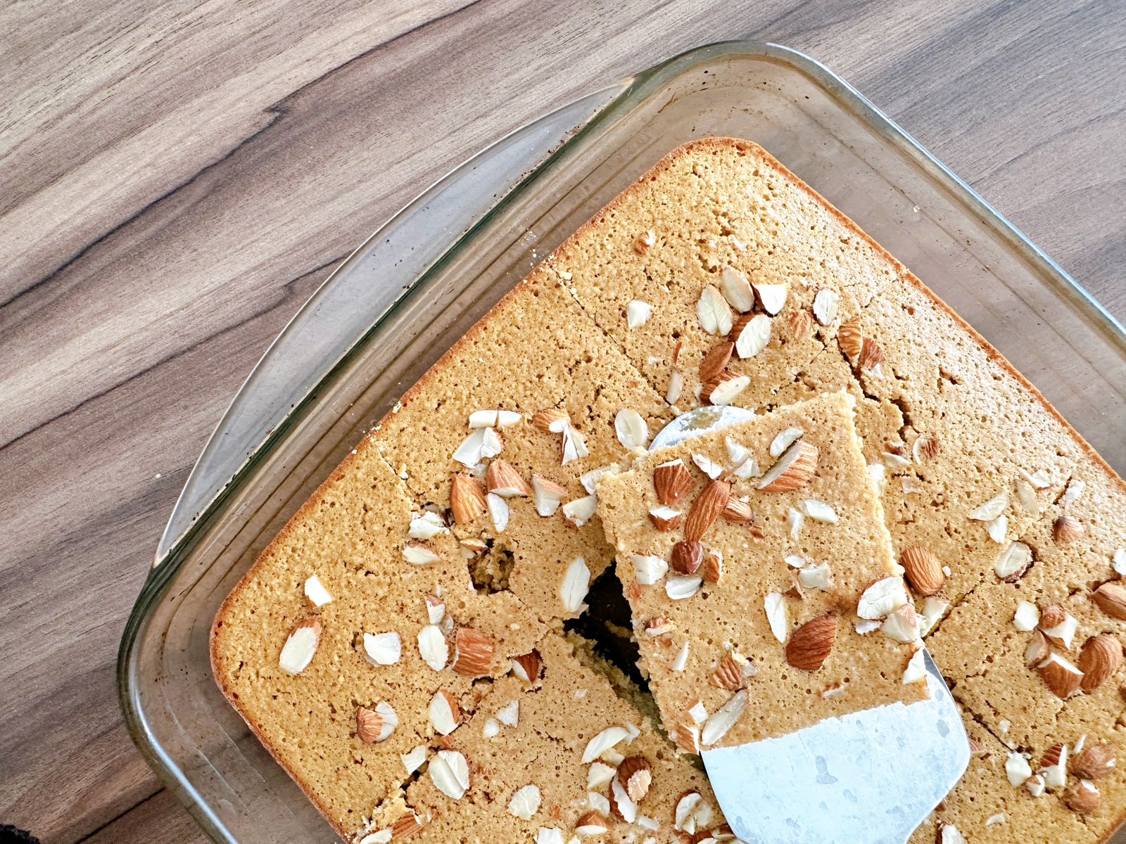 - Echar la mezcla en un molde engrasado y decorar con almendras picadas.