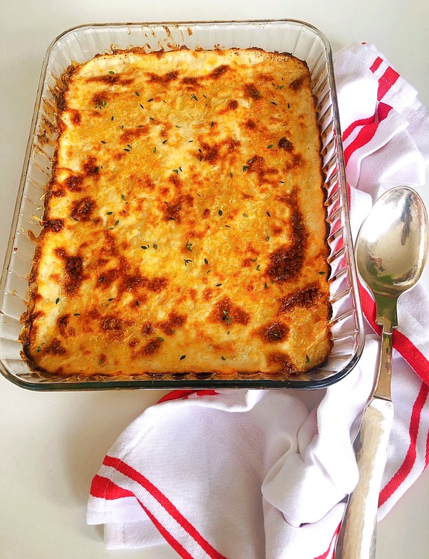 Un acompañamiento perfecto Navidad. La textura es deliciosa y la combinación con pavo o chancho mejor aún. Es un pastel de papa diferente, normalmente lo hago con royal (huevo y leche) pero me provocó hacer una salsa blanca y la combinación salió bien rica. Además la salsa blanca es hecha con aceite de oliva y harina de avena.